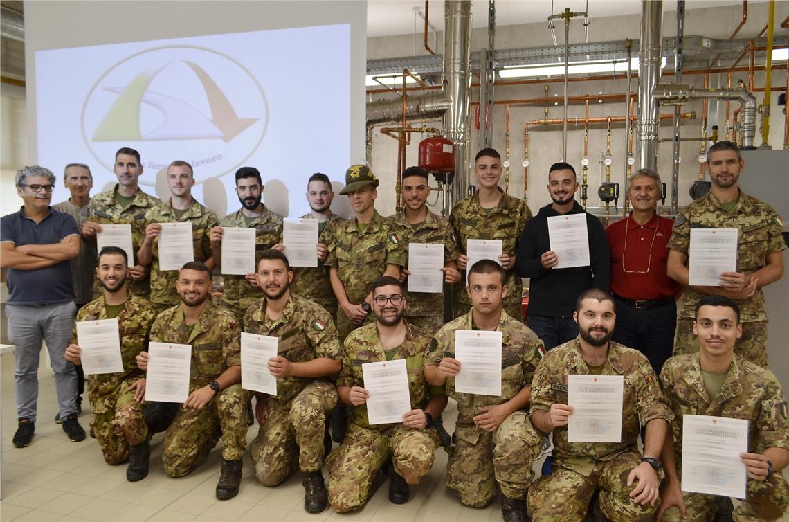 Si è tenuta nei giorni scorsi presso la Scuola professionale per l’artigianato e l’industria Luigi Einaudi di Bolzano, la cerimonia conclusiva del corso per “conduttori impianti termici”, che ha visto la partecipazione di varie categorie di militari in ferma prefissata e breve, selezionati attraverso specifici colloqui, tenuti da personale del Comando Truppe Alpine con la qualifica di “Orientatore professionale”.