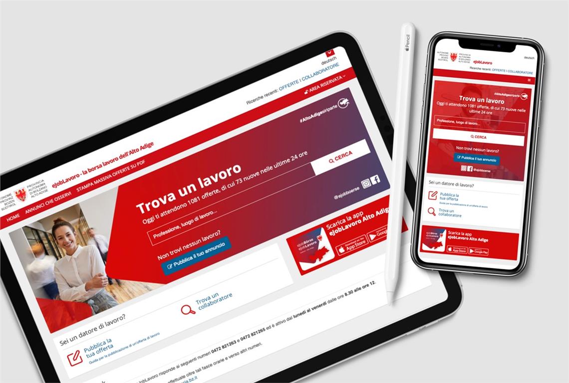 L'eJobLavoro della Ripartizione Lavoro della Provincia è a disposizione delle aziende e di chi cerca lavoro da oltre 20 anni. Attualmente sono disponibili più di 1.000 offerte di lavoro al giorno. Sono presenti soprattutto posti di lavoro nel settore ricettivo, ma anche posti per persone altamente qualificate come personale amministrativo superiore, amministratori delegati, ingegneri di produzione e logistica e informatici.