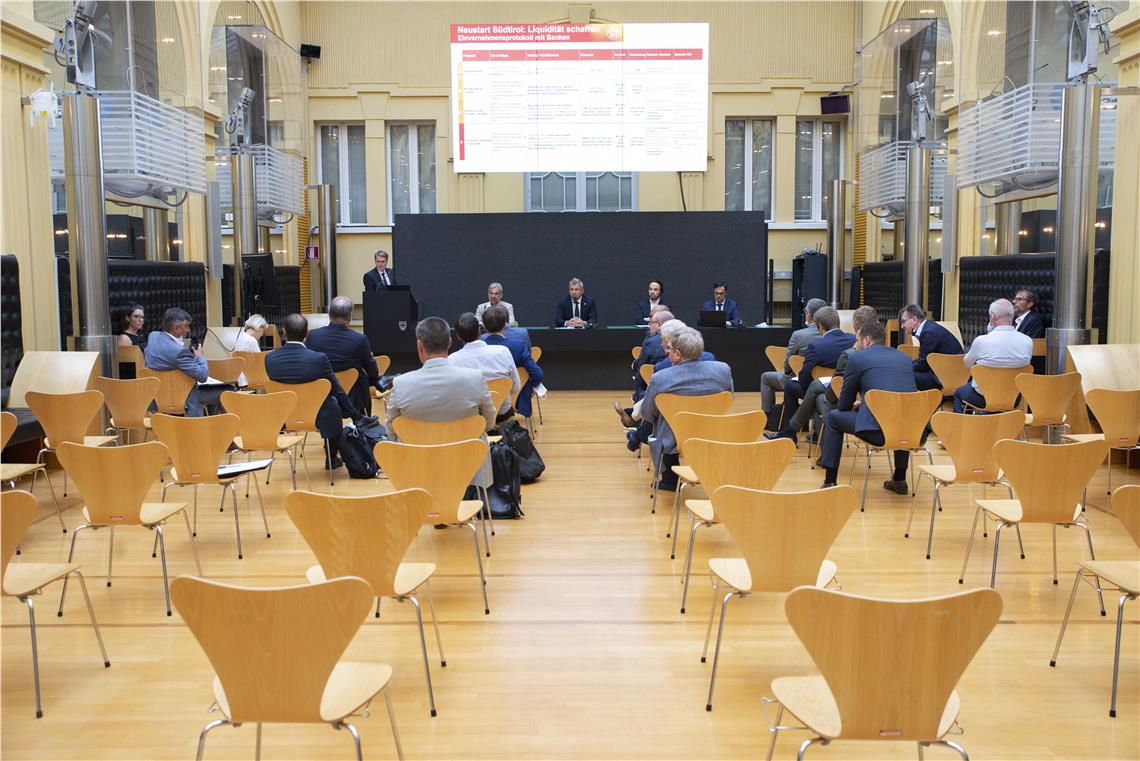Uno dei punti centrali dell'incontro di oggi è stato il protocollo d'intesa fra la Provincia e le banche per creare liquidità. Oltre 18.000 imprese e famiglie hanno chiesto il differimento di un prestito in corso per un totale di 4,76 miliardi di euro. Sono state presentate 4.205 domande di prestito, in 3.370 casi il prestito è già stato erogato. Tutte le associazioni di categoria hanno preso la parola e riferito le loro esperienze. Nel corso di questo scambio sono emerse critiche ai tassi d'interesse praticati dalle banche. I rappresentanti dell'economia si sono detti favorevoli a un prolungamento delle moratorie. Sono emerse richieste per regole chiare nell'accesso ai finanziamenti e agli aiuti, così come misure specifiche per singoli settori. A questo proposito, le banche hanno fatto notare che il tasso di interesse medio è stato dell'1,15%.