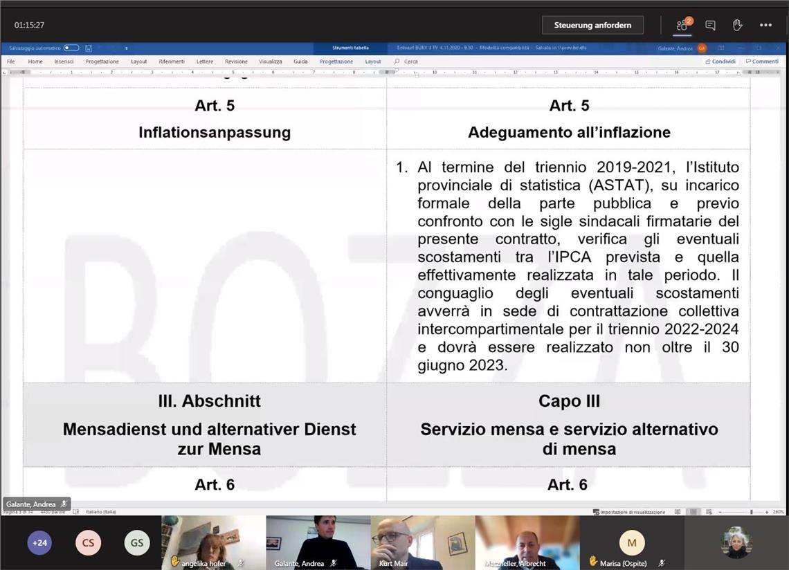 La bozza contrattuale posta oggi al centro delle trattative, prevede, dal 1° gennaio 2021, un ulteriore adeguamento degli stipendi dei dipendenti pubblici al tasso di inflazione, che per il prossimo anno applica la rivalutazione dell'1,1 per cento in base all'indice IPCA. Si tratta di un’innovazione sostanziale in questo contratto intercomparto triennale, ha fatto presente il direttore della Ripartizione personale Matzneller. “Con questo contratto abbiamo liquidato adeguamenti all’inflazione basati sull’indice IPCA al 1° gennaio di ogni anno. Per il 2019 tale indice era dello 0,9 %, nel 2020 dell’1 %”. L’effettivo conguaglio rispetto al reale tasso d’inflazione dovrebbe avvenire al più tardi entro il 30 giugno 2023, in sede delle contrattazioni per il nuovo contratto di comparto 2022-2024.