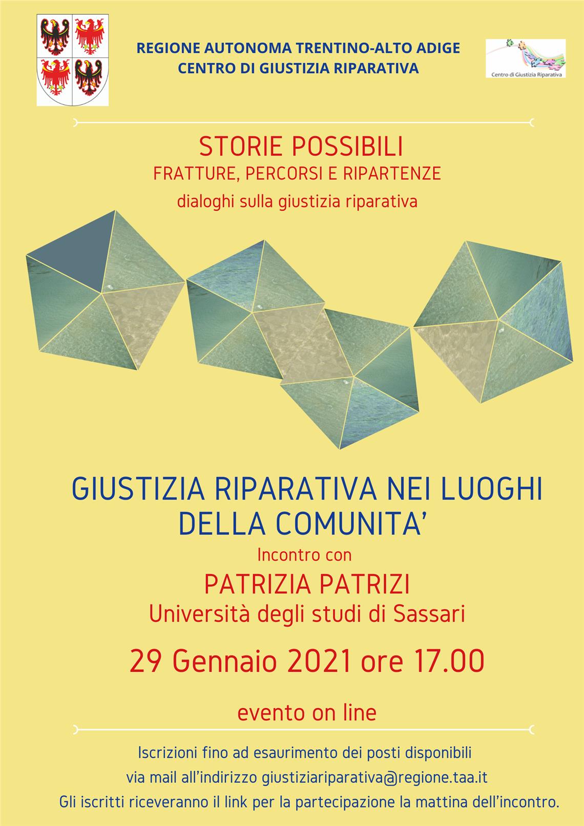 Il Centro per la giustizia riparativa della Regione Trentino – Alto Adige organizza un ciclo di incontri online dal titolo "Dialoghi sulla giustizia riparativa". Il secondo di questi appuntamenti avrà luogo venerdì 29 gennaio 2021 alle ore 17, e sarà incentrato sul tema "Giustizia Riparativa nei luoghi della Comunità". Relatrice sarà Patrizia Patrizi dell'Università degli studi di Sassari, dove insegna Psicologia giuridica e pratiche di giustizia riparativa, nonchè presidente di PsicoIus (Scuola romana di psicologia giuridica) e componente del consiglio dell’European Forum for Restorative Justice.