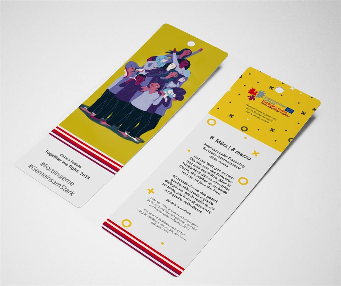 Il segnalibro dell'azione dall'Euregio #FortiInsieme indirizza messaggi significativi alle donne dei territori dell'Euregio Tirolo, Alto Adige e Trentino. Il fronte del segnalibro reca il messaggio di Malala Yousafzai, vincitrice del Premio Nobel per la Pace, incentrato sulla forza delle donne. Sul retro il segnalibro reca l’immagine dell’opera dell'artista Chiara Fedele “Together we fight” che raffigura donne forti e felici, sorrette e sostenute da uomini con stima e in modo ugualitario.