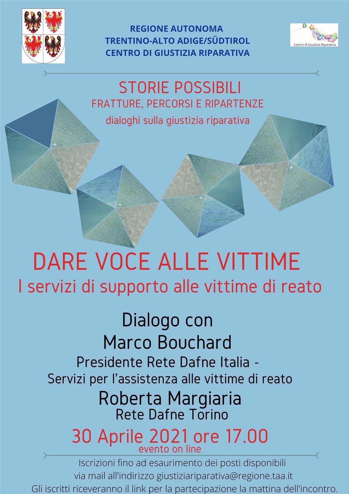 Venerdì 30 aprile, alle 17, si svolgerà il quinto appuntamento online dei “Dialoghi sulla Giustizia riparativa” dal titolo “Dare voce alle vittime" dedicato ai servizi di supporto alle vittime di reato. Prenderanno parte all’incontro online Marco Bouchard, già magistrato, autore, docente, socio fondatore di "Rete Dafne Torino" e presidente di "Rete Dafne Italia" e Roberta Margiaria, psicologa e psicoterapeuta.