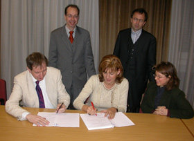 Da sx, il responsabile della ADLIB, Berend Degenhart Drenth, il direttore della filiale berlinese ADLIB, Klaus Bulle, l'ass. Kasslatter Mur, il direttore di Ripartizione Armin Gatterer e Katharina Pircher. Foto: Ripartizione Cultura tedesca.