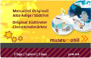 La Museumobil Card permette, con un unico biglietto, di entrare in circa 80 musei e utilizzare tutti i mezzi pubblici dell’Alto Adige per 7 o 3 giorni. Dal 1° novembre 2012 al 6 gennaio 2013, la museumobil Card da 3 giorni sarà in vendita in una simpatica edizione natalizia.