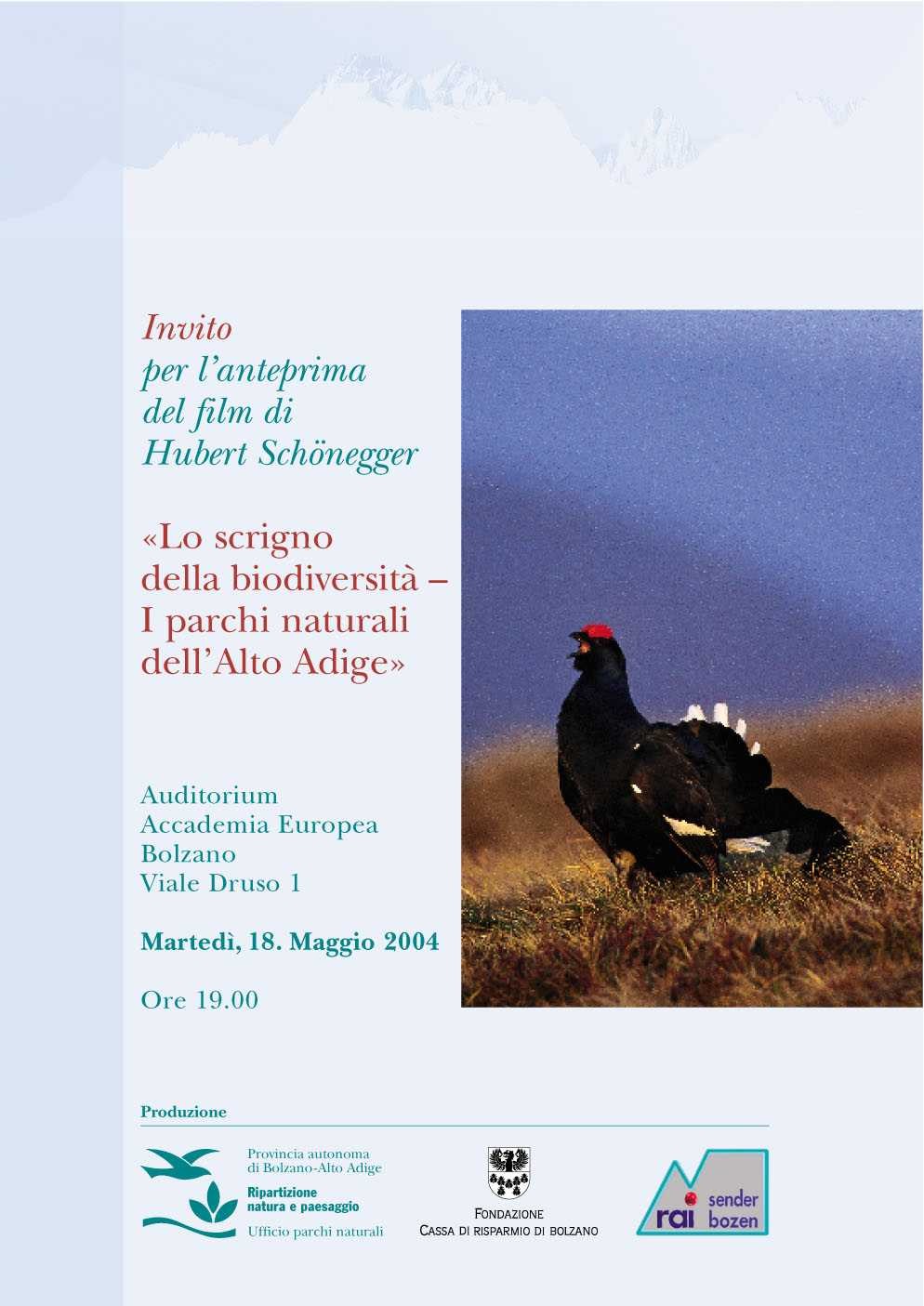 Martedì 18 maggio alle ore 19 presso l'Auditorium dell'Accademia Europea di Bolzano è in programma l'anteprima del film di Hubert Schönegger "Lo scrigno delle biodiversità - I parchi naturali dell'Alto Adige".