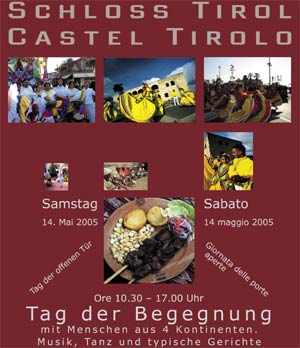 14. Mai: Tag der Begegnung auf Schloss Tirol.Menschen aus Amerika, Asien, Afrika und Europa treffen sich morgen auf Schloss Tirol. Sie erzählen über ihre Heimat, führen folkloristische Tänze vor, kleiden sich in ihren Trachten und kochen typische Gerichte. Eröffnet wird der Tag von Landesrat Otto Saurer um 10.30 Uhr. Danach beginnen die Vorführungen, die bis in die Abendstunden andauern. Um 12.30 Uhr wird eine deutsche, um 14 Uhr eine italienische und um 15.30 Uhr eine englische Führung zum Thema Landesgeschichte angeboten. Alle Interessierten sind zum Tag der Begegnung im Landesmuseum für Kultur- und Landesgeschichte Schloss Tirol eingeladen.