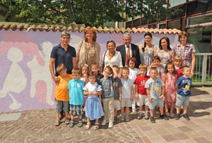 In Kurtinig, wo der Künstler Martin Pohl mit einer Kindergartengruppe gearbeitet hat, wurde die Aktion Kreativität an Schule und Kindergarten heute offiziell abgeschlossen. Nach einer Vorstellung des Projekts wurde die von den Kindergartenkindern im Rahmen des Kreativitätsprojekts gestaltete Außenwand enthüllt. Anschließend eröffnete Bildungs- und Kulturlandesrätin Sabina Kasslatter Mur die Ausstellung von Kinderzeichnungen, die im Rahmen des Kunstprojekts entstanden sind. Anwesend waren neben dem Künstler Martin Pohl und den kleinen Künstlerinnen und Künstlern der stellvertretende Direktor im Landesamt für Kultur, Thomas Pardatscher, die Leiterin des Kindergartensprengels Neumarkt, Beatrix Aigner, Kindergartenleiterin Sabine Peer und Bürgermeister Manfred Mayr.