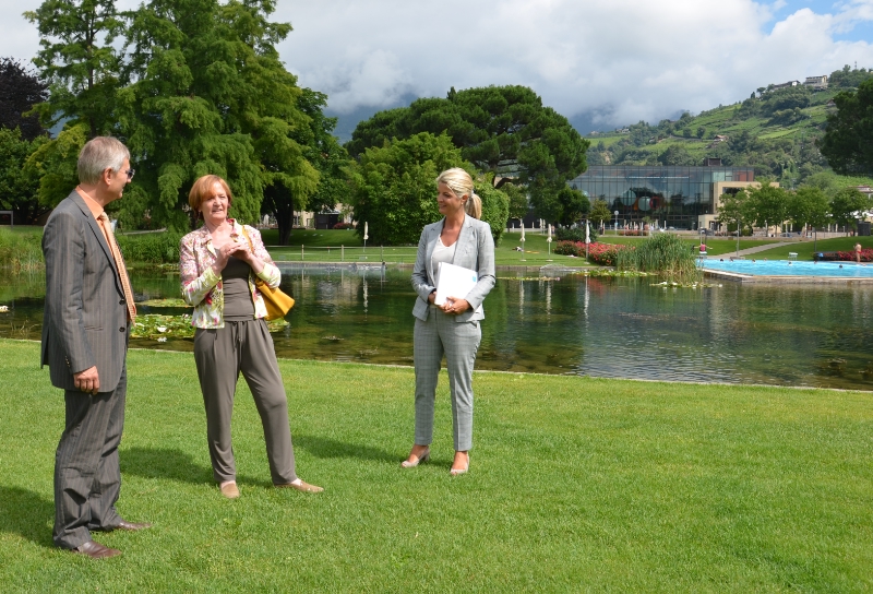 LPA - Über die Therme Meran und ihre Angebote im Bereich Thermalkuren sowie künftige Projekte hat sich Gesundheitslandesrätin Martha Stocker kürzlich bei einem Gespräch mit Direktorin Adelheid Stifter und Präsident Andreas Cappello in der 7650 Quadratmeter umfassenden Thermenlandschaft kundig gemacht.