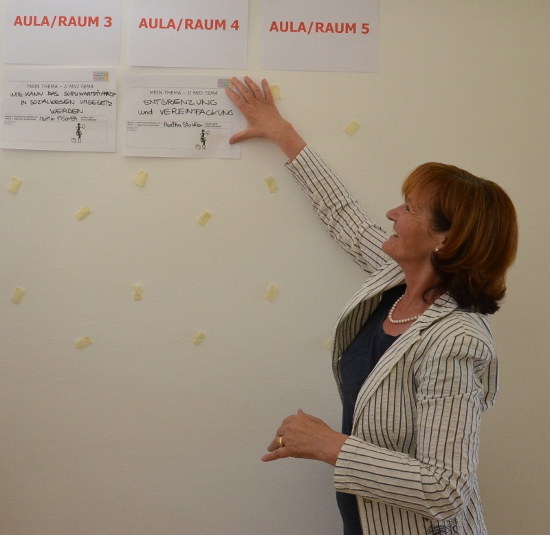 Etwa 80 Interessierte, hauptamtliche Mitarbeiter und Führungskräfte des Sozialwesens, direkt Betroffene, freiwillige Helfer, Sozialreferenten auf Gemeindeebene sowie Vertreter der Wirtschaft, Kultur, Bildung, Sport, Gesundheit, Familienagentur, Arbeit und Wohnen brachten sich bei der Open-Space-Veranstaltung mit ihren vielfältigen Erfahrungen und Ideen ein. Nach der Begrüßung durch Landesrätin Martha Stocker diskutierten die Teilnehmerinnen und Teilnehmer ihre 15 mitgebrachten Fragestellungen zum Tagesthema. In kleinen Arbeitsgruppen ging es dabei in erster Linie um soziale Potentiale, die in den Kunden der sozialen Organisationen und den örtlichen Gemeinschaften vielfach brach liegen oder nicht im vollen Umfang genützt werden. Quartiersarbeit, Entgrenzung und Vereinfachung, das Subsidiaritätsprinzip im Sozialwesen, die Potentiale der Menschen und Territorien, die Inklusion, die stärkere Einbeziehung der Betroffenen durch die Sozialen Dienste, die Zusammenarbeit zwischen Sozialem und Gesundheit wurden dabei ebenso thematisiert wie das Soziale Lernen und die Unterstützung sozialer Kompetenzen, alternative Wohnformen für das Alter, Zeit für die Gemeinwesenarbeit, die Frage ob das Pflegegeld automatisch eine gute Pflege garantiert und die verstärkte Kooperation zwischen sozialen Organisationen sowie Sport-, Kultur- und Umweltverbänden. Zudem wurden die Planung und Steuerung der Sozialraumorientierung und der Beitrag vonseiten der Institutionen diskutiert.