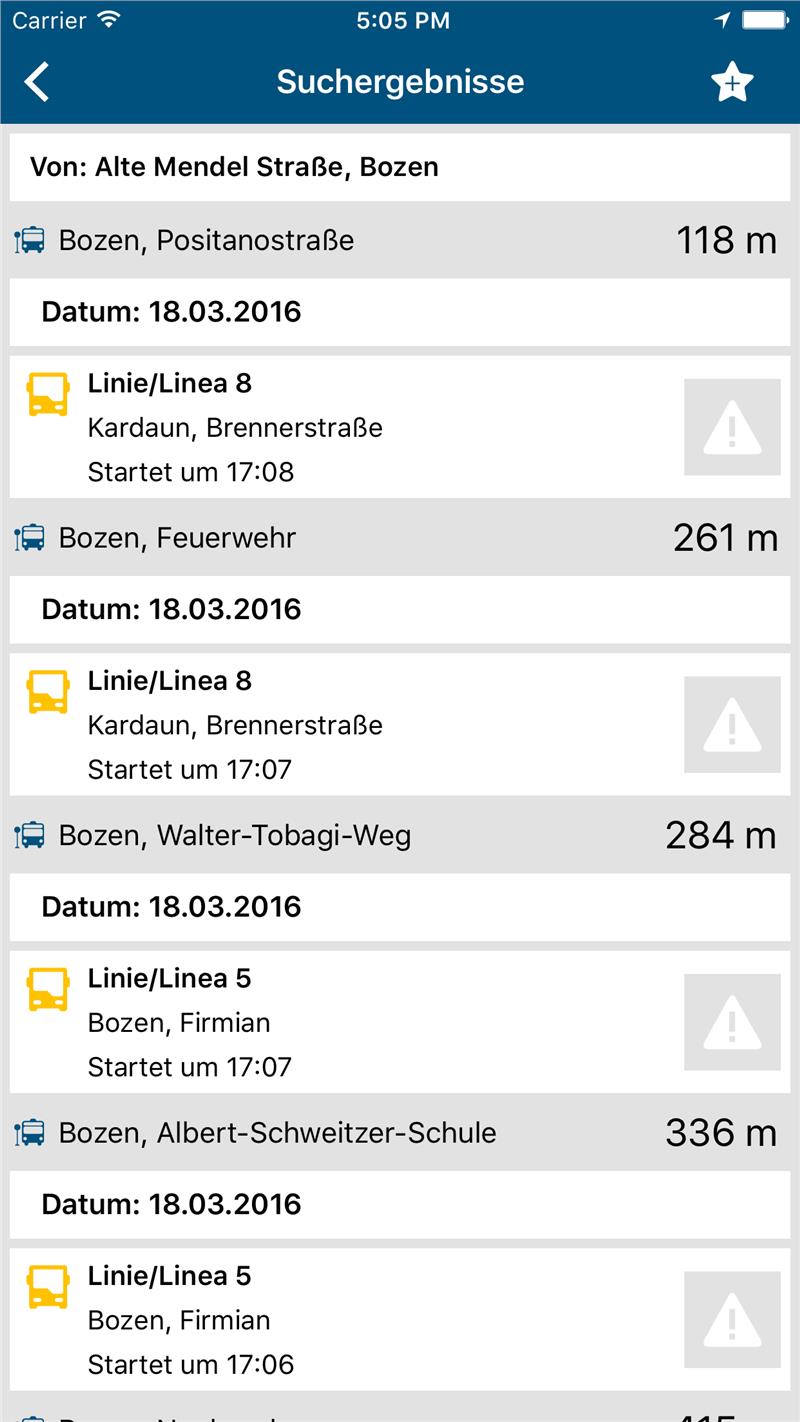 Mit kleinem Warndreieck gekennzeichnet sind „Hinweise“, die stets aktuell über allfällige Fahrplanänderungen, über mögliche Verzögerungen und mit allem Wissenswertem zu einzelnen Bus- oder Bahnlinien informieren. Die Farbe des daneben stehenden Symbols gibt Aufschluss über die Priorität der Meldung: Rot steht für sehr wichtige oder top-aktuelle Meldungen, mit gelbem und blauem Symbol sind die Meldungen mit geringerer Priorität bzw. weniger aktuelle Meldungen gekennzeichnet.