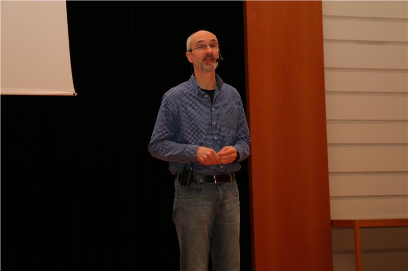 Anschließend hielt Professor Norbert Hungerbühler, der am Mathematikinstitut der Eidgenössischen Technischen Hochschule in Zürich lehrt, ein Referat zum Thema "Skalierbare Themen im Mathematikunterricht". Unter "skalierbar" ist hierbei zu verstehen, dass dieselben Themen entlang der gesamten Schullaufbahn immer wieder aufgegriffen und auf neue Gebiete ausgeweitet werden können. Er erklärte, dass sich manche Themen des Mathematikunterrichts in aufsteigender Komplexität, Anwendbarkeit, Methodenvielfalt und Tiefe vom Kindergarten bis hin zur mathematischen Forschung bearbeiten lassen. Indem man sie in unterschiedlicher Form ständig neu in den Unterricht einfließen lässt, entstehe für die Schülerinnen und Schüler ein kohärentes Bild vom inneren Aufbau und Zusammenhang mathematischer Inhalte, berichtete Professor Hungerbühler und stellte dann einige dieser Themen vor: Dies sind beispielsweise Origami, Kryptographie, Statistik, Spieltheorie, Zerlegungs- und Raumgeometrie oder Beweise. Skalierbare Themen bieten immer wieder Herausforderungen, welche die Weiterentwicklung des Wissens motivieren, erklärte der Professor. Nach dem Referat fand dann eine gemeinsame Diskussionsrunde mit allen Teilnehmern statt.
