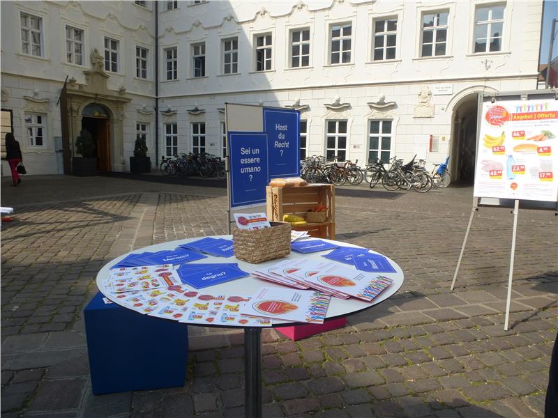 Mit Plakaten und einem Diskussionstisch wurden die Passanten am Musterplatz in Bozen auf das Thema der Wirtschaftsflucht aufmerksam gemacht. Menschenrechte sind dieses Jahr das Schwerpunktthema der Aktionstage, und das Menschenrecht auf angemessene Ernährung ist in der Menschenrechtskonvention für wirtschaftliche, soziale und kulturelle Rechte verankert.