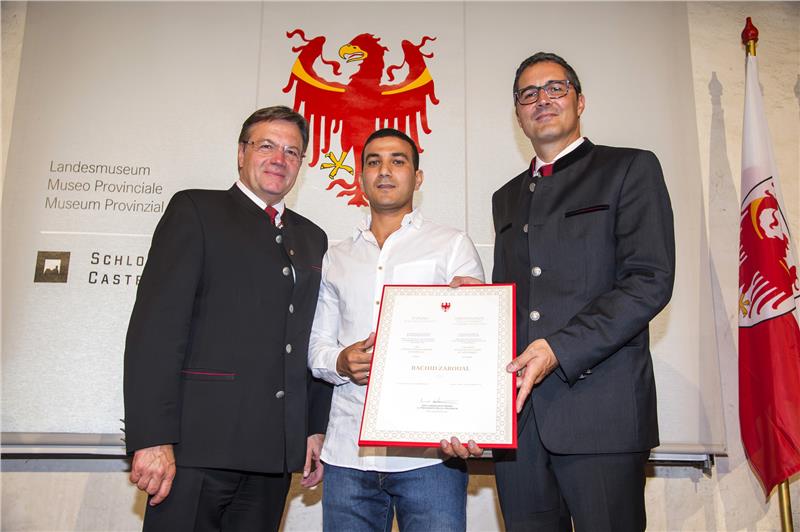 Im Rahmen des Festakts auf Schloss Tirol wurden heuer erstmals in Südtirol auch eine Verdiensturkunde an einen Lebensretter vergeben. Landeshauptmann Kompatscher überreichte sie an Rachid Zaroual, der vor einem Jahr, und zwar am 6. Oktober 2015, in Bozen eine Frau aus dem Eisack gerettet hat. Raichid Zaroual wurde am 28. Mai 1984 in Marrakesh in Marokko geboren; 2014 wanderte er nach Italien aus, wo er im Rahmen des Projektes "Alba" des Vereins "La strada - Der Weg" arbeitet. Mit der Lebensrettungsurkunde sollen auch künftig in Südtirol - so wie es im Nachbarland Tirol schon seit langem geschieht - Personen ausgezeichnet werden, die in einer gefährlichen, lebensbedrohenden Situation Beistand geleistet haben.