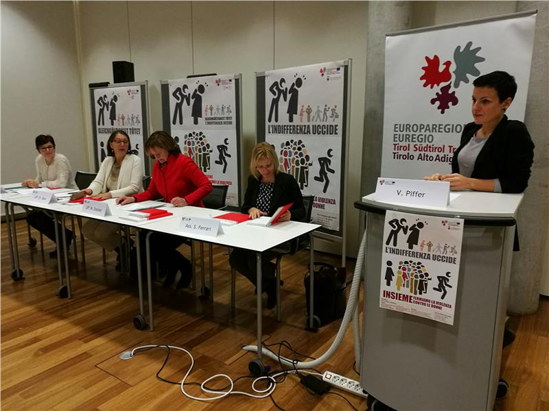 Häusliche Gewalt gegen Frauen nimmt zu und kennt keine geographischen Grenzen. Sie beschränkt sich nicht auf ein bestimmtes Alter oder eine bestimmte Hautfarbe und betrifft alle Arten familiärer Beziehungen und soziale Klassen. Statistiken zeigen, dass 12 bis 15 Prozent der Frauen in Europa jeden Tag Opfer häuslicher Gewalt sind. Sie ist eine der am weitesten verbreiteten Menschenrechtsverletzungen weltweit und muss auch in der Europaregion bekämpft werden. Die drei Landesrätinnen Martha Stocker aus Südtirol, Sara Ferrari aus dem Trentino, Christine Baur aus Tirol, Euregio-Generalsekretärin Valentina Piffer und Amtsdirektorin Petra Frei haben haben am heutigen Dienstag in Bozen die Euregio-Sensibilisierungskampagne "Gemeinsam stoppen wir Gewalt gegen Frauen" vorgestellt.