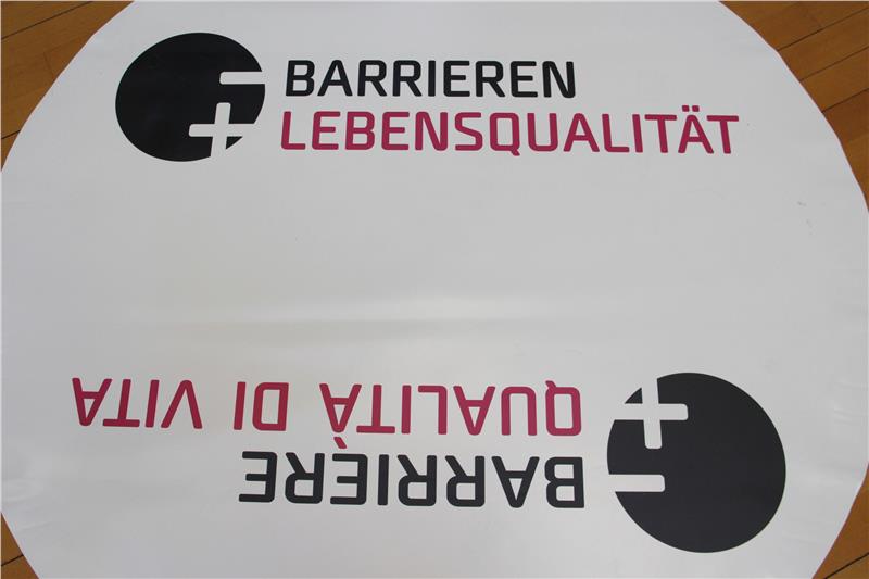 50 Teppiche mit dem Logo der dreijährigen Sensibilisierungskampagne des Landes mit dem Motto „Weniger Barrieren, mehr Lebensqualität“ werden demnächst in den Eingangsbereichen der Landhäuser und des Landtages, in den Rathäusern der großen Gemeinden, in den Sprengelsitzen der Bezirksgemeinschaften, in den Sitzen der Berufskammern, in den technischen Fachoberschulen und der Universität für Bildungswissenschaften ausgelegt. Die Teppiche haben einen Durchmesser von 1,5 Metern und sollen den Bedarf an notwendiger Rotationsfläche aufzeigen, um sich selbständig und autonom bewegen zu können.