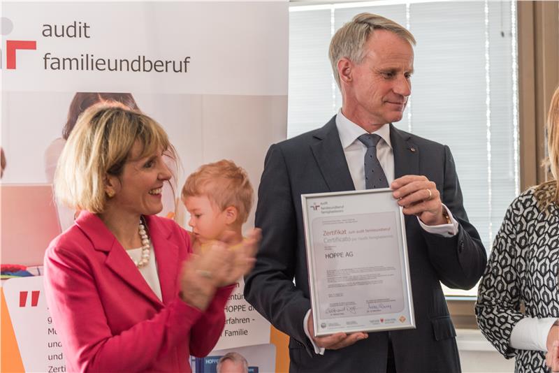 "Die Firma Hoppe hat alle Phasen des Audits erfolgreich durchlaufen und ist somit ein Vorbild für Südtiroler Unternehmen, welche die Vereinbarkeit von Familie und Beruf für ihre Mitarbeiter anstreben", betonte Familienlandesrätin Waltraud Deeg heute (19. Oktober) bei der Verleihung des höchsten Zertifikates "audit familieundberuf" an den Verwaltungsratspräsident Christoph Hoppe. Familienfreundlichkeit sei laut Deeg keine Gefälligkeit, sondern eine strategische Investition, denn sie bringe ganz konkrete Vorteile für alle Beteiligten. Nicht zuletzt die vor kurzem präsentierte Jugendstudie zeige auf, dass Familie für die Jugend ein Thema von zentraler Bedeutung sei, "und ich bin mir sicher", so Deeg, "dass Familienfreundlichkeit für junge, qualifizierte und engagierte Mitarbeiter noch stärker als bisher zu einem bedeutenden Entscheidungskriterium bei der Wahl des Arbeitsplatzes wird."