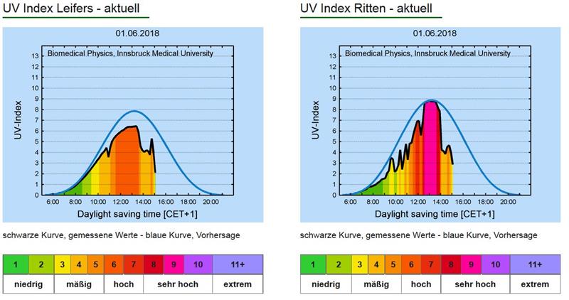 Abrufbar in Echtzeit ist der aktuelle UV-Index für die Messstationen Leifers und Ritten mit einer Vorhersage für den UV-Index bei wolkenlosem Himmel. Ebenso sind der Tagesverlauf des UV-Indexes des vorhergehenden Tages, die Tageshöchstwerte der vergangenen 30 Tage und die Monatsmittel und höchsten gemessenen Einzelwerte des vergangenen Jahres verfügbar. Die Veröffentlichung des UV-Indexes auf der Webseite der Landesumweltagentur erfolgt in Zusammenarbeit mit der Sektion für Biomedizinische Physik der Medizinischen Universität Innsbruck, die das UV-Messnetz Österreich leitet.