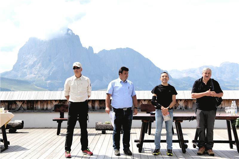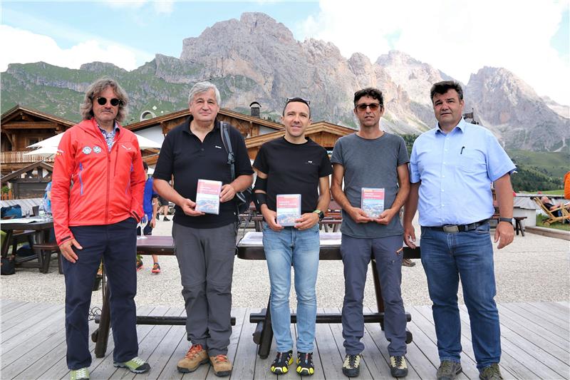 Die Landesräte Christian Tommasini und Florian Mussner haben den neuen Trail heute (2. August) am Col Raiser in Wolkenstein, wo der Weg in der Nähe vorbeiführt, zusammen mit dem dazugehörigen Wanderführer mit Karten von Christjan Ladurner und Corrado Morelli vorgestellt.