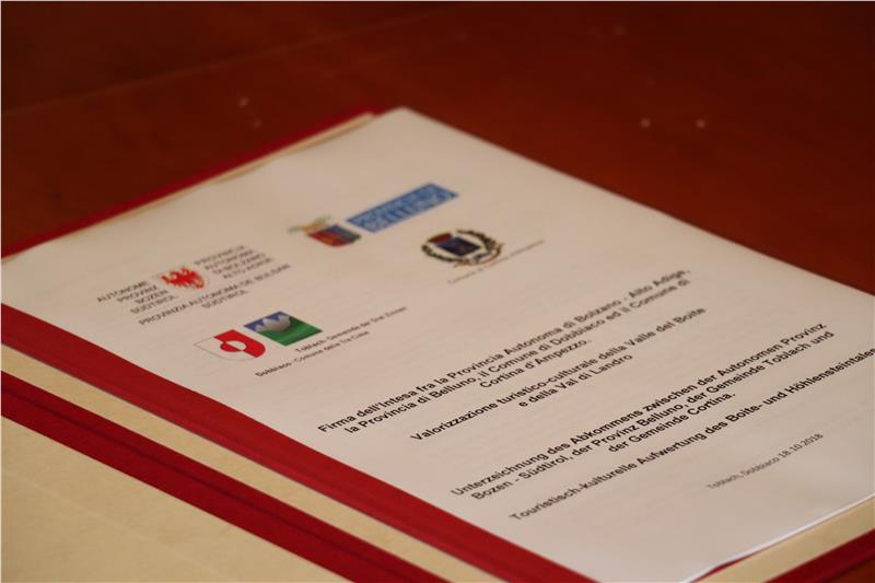 Südtirols Landeshauptmann hat heute (18. Oktober) die Vereinbarung zur touristisch-kulturellen Aufwertung des Boite- und Höhlensteintals an der Grenze zwischen dem Pustertal in Südtirol und dem Cadore in Venetien unterzeichnet. Neben dem Land Südtirol haben auch der Landeshauptmann der Provinz Belluno und die Bürgermeister der beiden Gemeinden Toblach und Cortina ihre Unterschrift unter das Protokoll und damit einen ersten Schritt zur Umsetzung eines umfassenden Maßnahmenbündels gesetzt, das aus dem Grenzgemeindenfonds finanziert wird. Nach der heute erfolgten Unterzeichnung wird die Machbarkeitsstudie ausgearbeitet, in der Kosten und Umsetzungszeiten definiert werden.