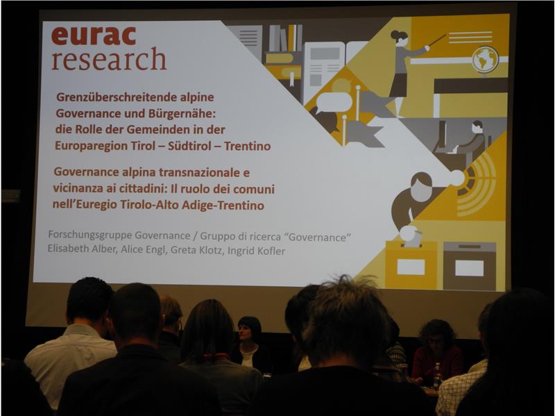 Elisabeth Alber, Alice Engl, Greta Klotz und Ingrid Kofler, Forscherinnen der Eurac Research Governance Group, stellten zunächst Hintergrund, Ausgangslage und Ziele sowie im weiteren Tagungsverlauf die Ergebnisse der Studie "Transnationale alpine Governance und Bürgernähe: Die Rolle von Gemeinden in der Europaregion Tirol-Südtirol-Trentino" vor. Dabei wurden Themen, Wahrnehmungen, Erwartungen sowie konkrete Ansätze und Projektideen der Zusammenarbeit erhoben und erarbeitet. Sie sollen künftig Denkanstoß sein für eine verstärkte und somit effizientere Zusammenarbeit zwischen Grenzgemeinden und dem Europäischen Verbund Territorialer Zusammenarbeit (EVTZ), aber auch das Potenzial und konkrete Ideen aufzeigen für Projekte zwischen Grenzgemeinden.