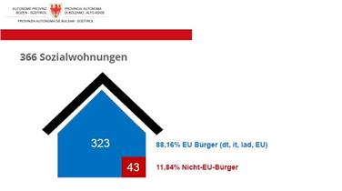 Leicht überproportional ist der Bedarf an Sozialwohnungen bei den Nicht-EU-Bürgern mit 29,21 Prozent (234 Ansuchen) der insgesamt 801 genehmigten Ansuchen mit mindestens 25 Punkten. Die EU-Bürger haben hingegen mit 567 Ansuchen 70,79 Prozent der genehmigten Gesuche vorgelegt. Daraus ergibt sich der Verteilungsschlüssel nach dem 88,16 Prozent der Sozialwohnungen (323) an EU-Bürger und 11,84 Prozent der Sozialwohnungen (43) an Nicht-EU-Bürger zugewiesen werden.