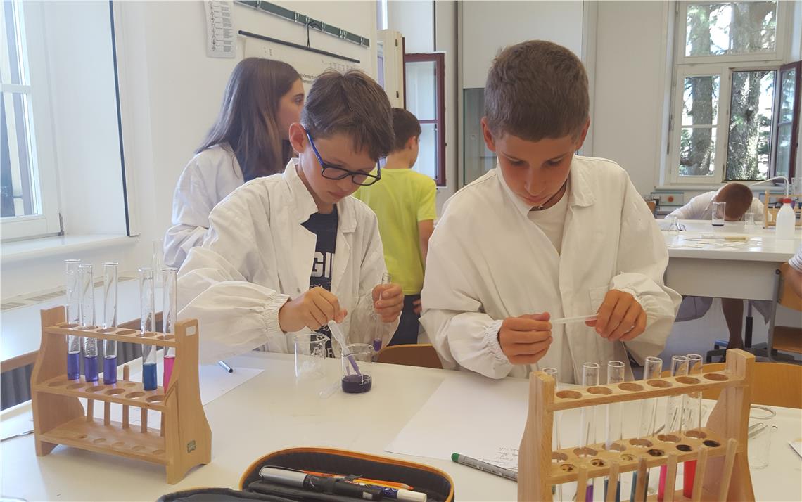 "Den Rätseln der Natur auf der Spur" war eine andere Workshop-Gruppe. Im Labor bedienten sich die Kinder wissenschaftlicher Arbeitsmethoden, um physikalische und chemische Vorgänge in der Natur zu untersuchen. Bereits bekannten Phänomenen, wie der Ausdehnung von Flüssigkeiten bei Erwärmung gingen sie dabei – zusammen mit den beiden Workshop-Leitenden Margit Demetz und Michael Gamper – genau auf den Grund. Bei Experimenten konnten die Teilnehmenden analysieren, wie chemische Stoffe miteinander reagieren – der gewünschte Knalleffekt blieb dabei natürlich nicht aus. Beim Sezieren von Fischen wurde der Körperbau von Wirbeltieren anschaulich gemacht. Und nicht zuletzt begaben sich die jungen Forschenden mit dem Mikroskop auf die spannende Reise, in die für das freie Auge nicht sichtbare Welt der kleinen Strukturen.