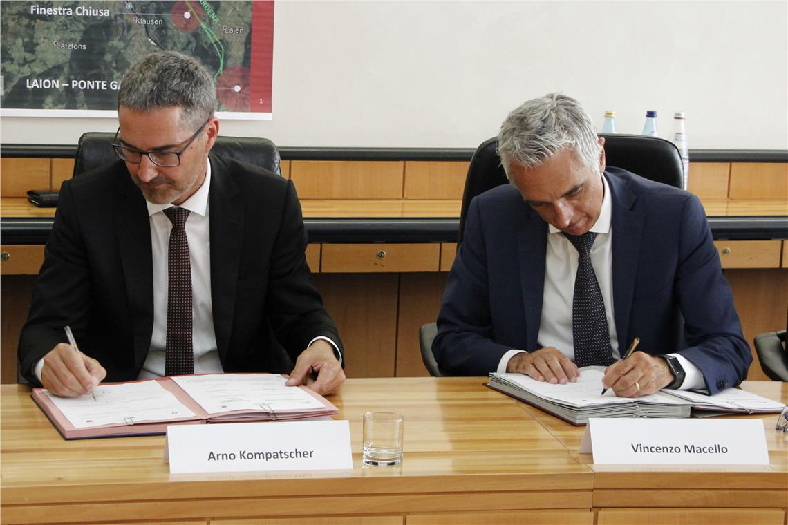 Die Forderungen der Gemeinden für die Zulaufstrecke Franzensfeste-Waidbruck sind berücksichtigt. Nun wurde mit LH Kompatscher und RFI-Vertreter Macello die Vereinbarung zur Genehmigung unterschrieben.
