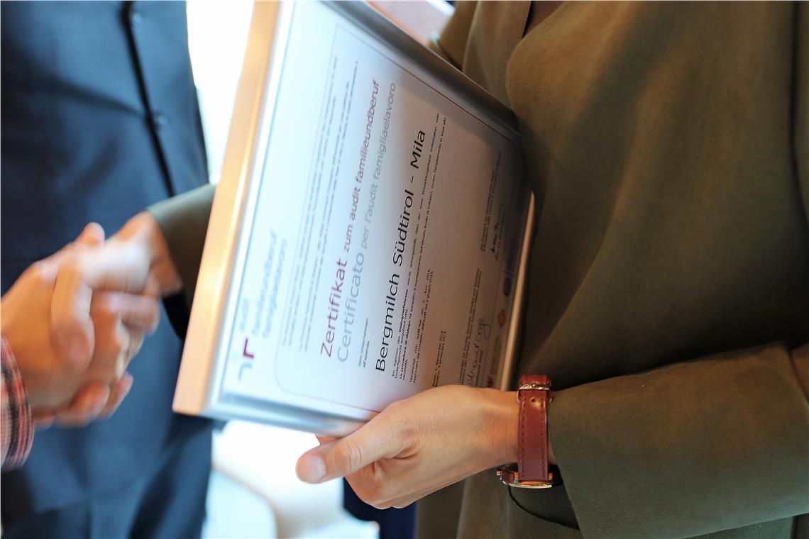 Arbeitgeber, die mittels einer familienfreundlichen Personalpolitik ihre Mitarbeitenden unterstützen, können seit dem Jahr 2004 das Audit "familieundberuf" absolvieren, welches von der Familienagentur des Landes gemeinsam mit der Handelskammer Bozen angeboten wird. Das Audit ist in mehrere Phasen gegliedert und wurde bisher von 83 Unternehmen, Vereinen und öffentlichen Verwaltungen erfolgreich absolviert. Nach der Südtirol-Niederlassung der Firma Hoppe ist die Mila-Bergmilch Südtirol nun das zweite Unternehmen, welches alle Phasen des Auditierungsprozesses absolviert hat. Bei Mila wurde das erste Audit 2009 durchgeführt, 2013 folgte die Re-Auditierung, im Jahr 2016 das Re-Audit Konsolidierung und schließlich 2019 das Re-Audit Dialog. Begleitet wurde die Genossenschaft dabei von Auditorin Christine Gostner von Stefenelli, die im Rahmen der Verleihung über bisherige Maßnahmen und Schritte berichtete.