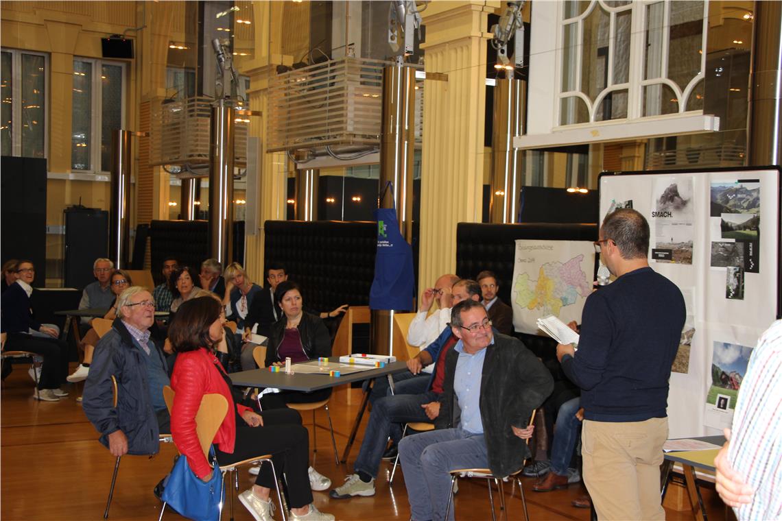 Das Planungsspiel wurde auch ausprobiert. Mitgespielt haben unter anderen Bildungsdirektor Gustav Tschenett, Amtsdirektor Martin Peer, der ehemalige Direktor im Amt für Weiterbildung, Hubert Bertoluzza, die Landtagsabgeordneten Brigitte Foppa und Maria Elisabeth Rieder, der ehemalige Landtagsabgeordnete Oswald Schiefer und die ehemalige Landesmusikschuldirektorin Irene Vieider. Mit dabei war auch Spielautor Stefan Fabi.