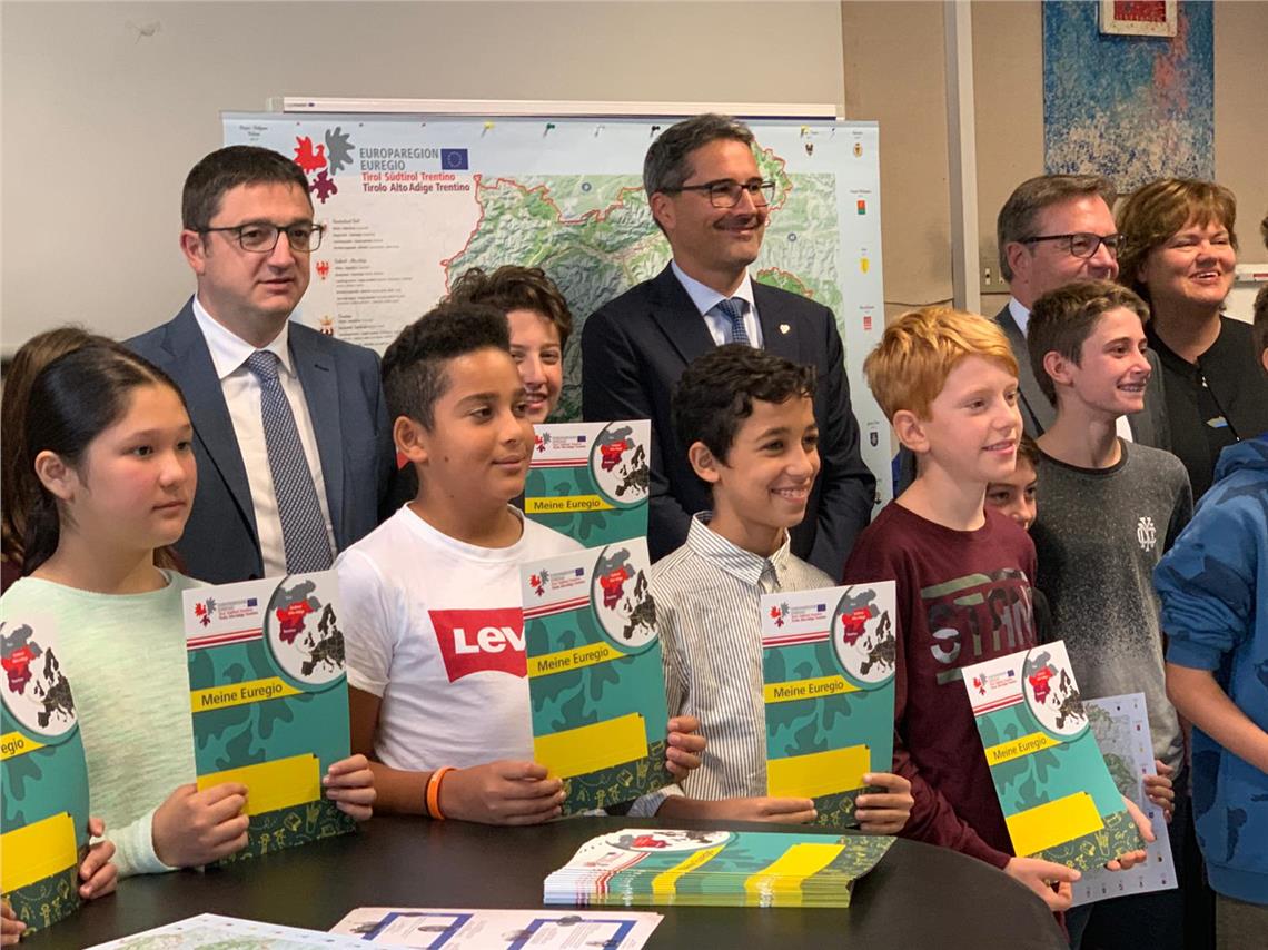 An der Mittelschule "Josef von Aufschnaiter" in der Leonardo-da-Vinci-Straße und anschließend an der Grundschule "Dante Alighieri" in der Sparkassenstraße kamen die drei Landeshauptleute mit Lehrpersonen sowie Schülerinnen und Schülern zusammen, denen sie neben der Euregio-Landkarte auch ergänzende Unterrichtsmaterialien überreichten.