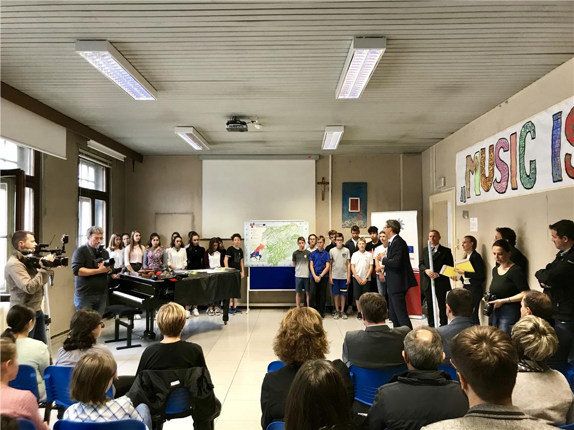 An der Aufschnaiter-Mittelschule haben Direktorin Ingrid Pertoll sowie die Schüler und Schülerinnen die Euregio-Delegation mit einem wegweisenden Stehtheater und Gesang empfangen. Landeshauptmann Kompatscher betonte: "Die Karte soll bewusst machen, dass wir in einem Europa leben, das uns bereits 70 Jahre Frieden und relativen Wohlstand gebracht hat, ein Europa, in dem die Grenzen überwunden wurden und die Zusammenarbeit unserer drei Länder, des historischen Tirols, wieder möglich ist."
