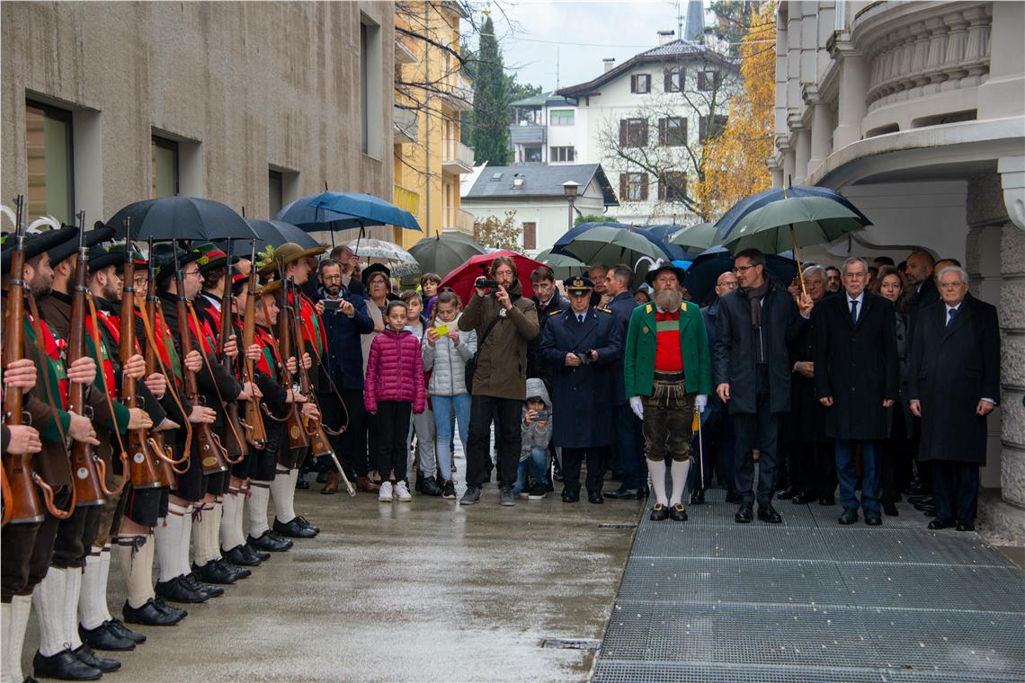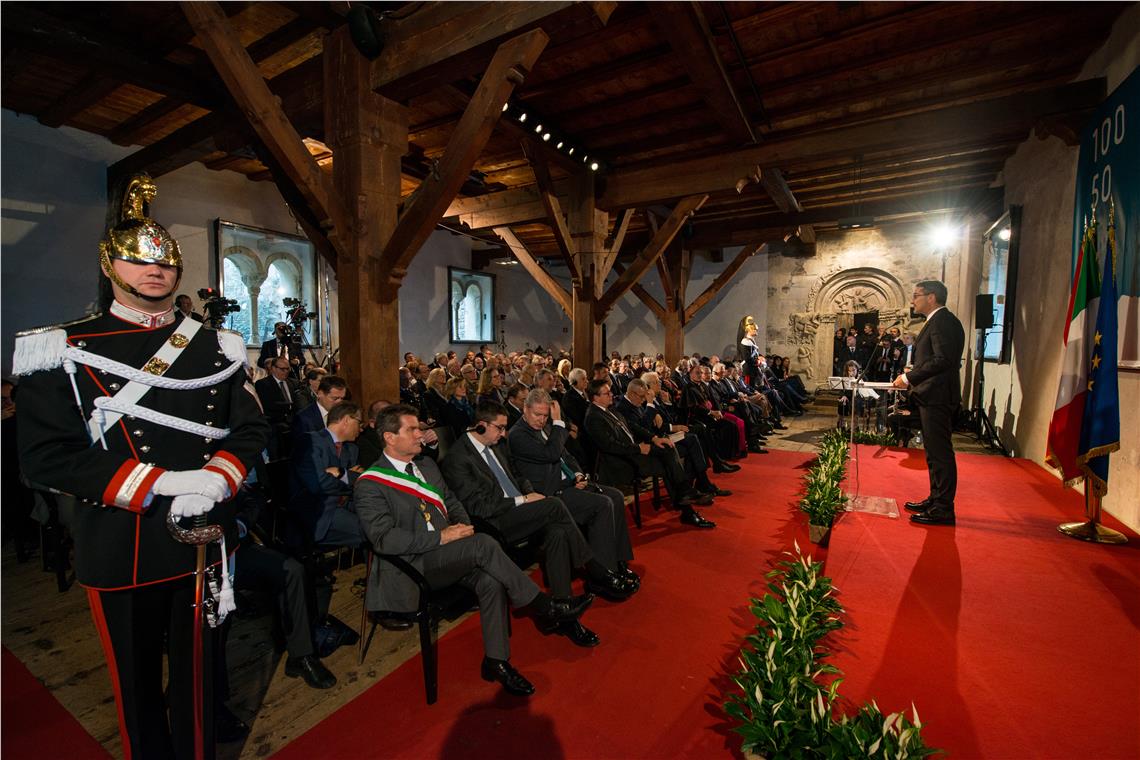 Landeshauptmann Arno Kompatscher unterstrich zu Beginn seiner Ansprache die große Ehre, Staatspräsident Sergio Mattarella und Bundespräsident Alexander Van der Bellen, die beiden Staatsoberhäupter der Signatarstaaten des Pariser Vertrages, auf Schloss Tirol begrüßen zu dürfen. Die Teilung Tirols vor 100 Jahren und die Annahme des Südtirol-Pakets vor 50 Jahren hätten für die Geschichte Tirols eine einschneidende und zeitenwendende Bedeutung.