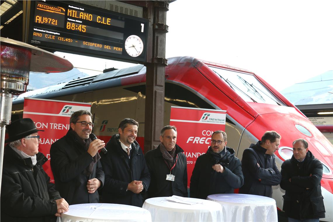 Die Direktverbindung Bozen-Mailand mit dem Freccia-Zug wurde am 15. Dezember in Bozen von LH Kompatscher, LR Alfreider und den Trenitalia-Vertretern Lo Piano und Hopfinger vor dem Start vorgestellt.
