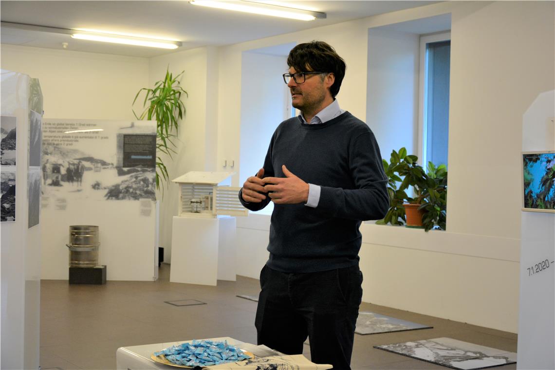 Roberto Dinale, Direktor im Landesamt für Hydrologie und Stauanlage sowie Kurator der Ausstellung, führte die angemeldeten Schulklassen durch die Bilderschau: In Fotovergleichen "Früher-Heute" und mit zeitgerafften Satelittenbilder-Slides steht die Gletscherwelt der Südtiroler Alpen auf dem Prüfstein.