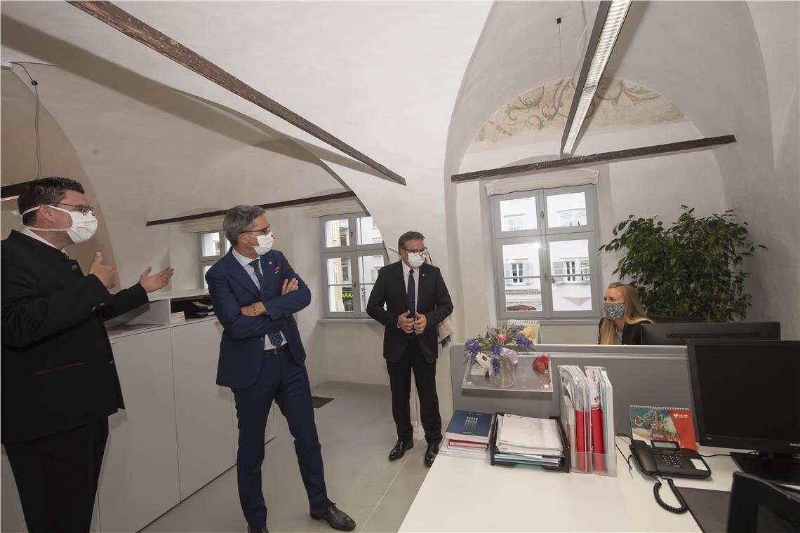Mit dem Umzug des Gemeinsamen Büros in den ersten Stock des Waaghauses in Bozen schlägt die Euregio ein neues Kapitel ihrer Geschichte auf: Ihre Gemeinsamkeit wird durch die neuen Räumlichkeiten in einem historischen Gebäude mitten im historischen Zentrum von Bozen auch für die Bürgerinnen und Bürger viel deutlicher sichtbar. Sechs modern eingerichtete Büroräume auf insgesamt 254 Quadratmetern stehen den Mitarbeiterinnen und Mitarbeitern der Euregio an der neuen Adresse Laubengasse 19/A für ihre Tätigkeit im Dienst der Zusammenarbeit der drei Länder zur Verfügung. Für die aufwendige Sanierung hat Architekt Wolfgang Piller gesorgt, der die Landeshauptleute durch die Räumlichkeiten des Waaghauses führte.