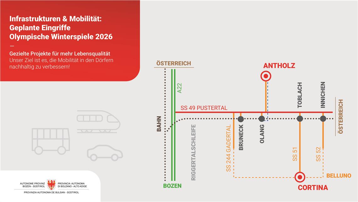 Mit mehreren neuen Infrastrukturen bringt das Land die Mobilität im Pustertal für 2026 für die Olympischen Spiele nachhaltig auf Vordermann. Wichtigstes Ziel ist laut Mobilitätslandsrat Daniel Alfreider, dass jene Vorhaben umgesetzt werden, die, langfristig die Mobilität und Lebensqualität im Pustertal und darüber hinaus verbessern und einen Mehrwert fürs ganze Land bringen.