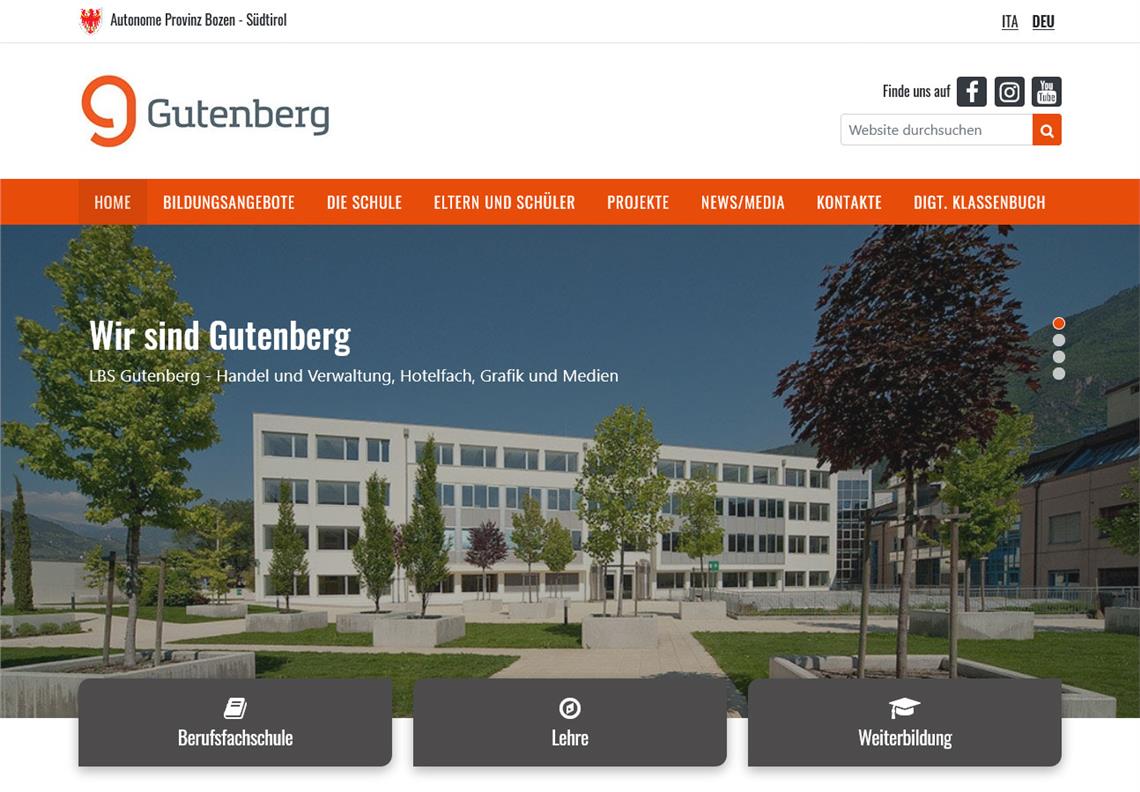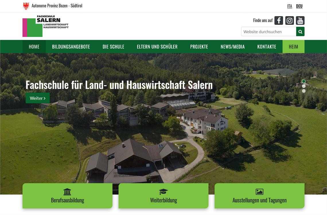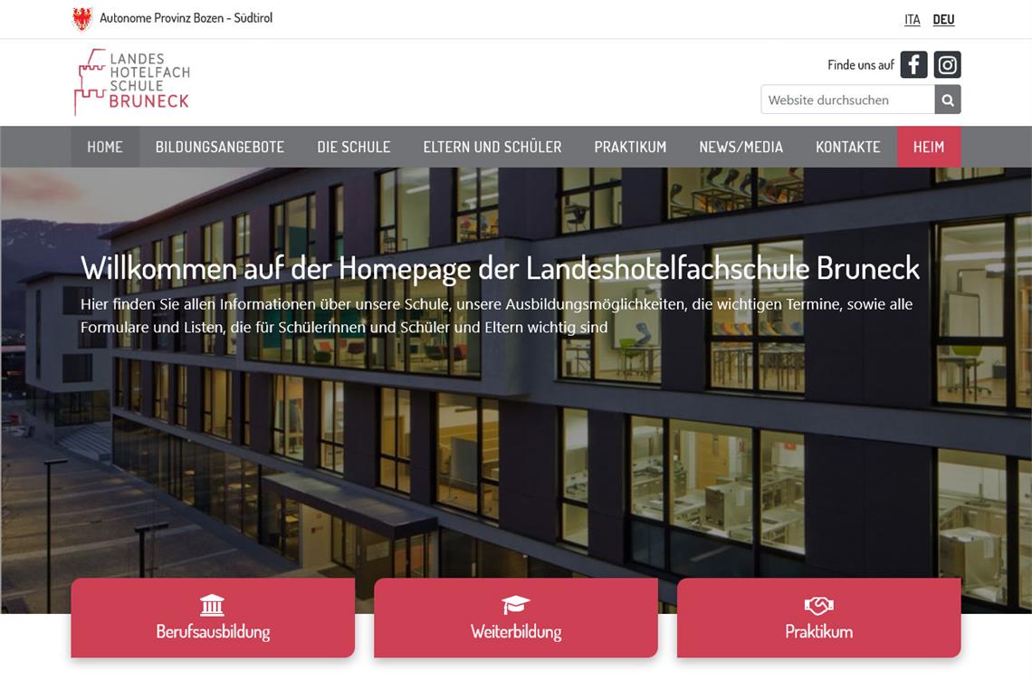 Anfang September wurden die ersten neuen Internetseiten der Landesberufsschulen online gestellt. Nun präsentieren sich weitere vier Schulen im Web modern und zeitgemäß. Es sind dies die Fachschule für Hauswirtschaft und Ernährung Salern, die Landeshotelfachschulen in Bruneck und Meran sowie die Landesberufsschule für Handel und Grafik "Johannes Gutenberg" in Bozen. Alle Schulen verfügen über ein umfangreiches Aus- und Weiterbildungsangebot und bieten darüber hinaus zahlreiche Projekte und Veranstaltungen an, die nun in völlig neuem Layout präsentiert werden.