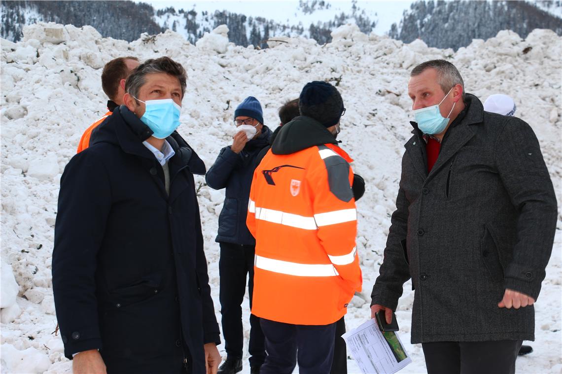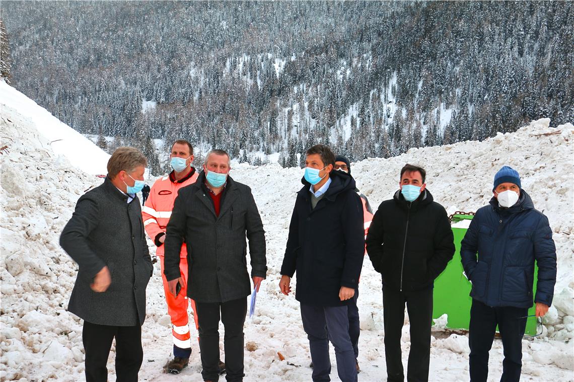 Gemeinsam mit Bürgermeister Christian Reichsigl, Vizebürgermeister Josef Mair, Tiefbauabteilungsdirektor Valentino Pagani, dem Direktor des Straßendiensts Salten-Schlern Marco Losso und Michael Unterweger vom örtlichen Straßendienst sowie dem Landtagsabgeordneten Franz Locher hat sich der Landesrat am 26. Jänner ein Bild von den umfangreichen Aufräumarbeiten und dem neuralgischen Straßenabschnitt gemacht. 21 lawinengefährdete Orte gebe es im Sarntal, jener in Weissenbach sei der gefährlichste, berichteten die Vertreter der Gemeinde. Hier gebe es bei starken Schneefällen mehrmals im Jahr Lawinenabgänge, meist auch auf die Straße.