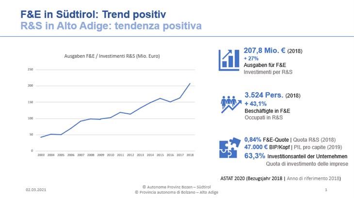 Die Zahlen im Bereich von Forschung und Entwicklung in Südtirol zeigen nach oben. Der Anteil der Ausgaben für Forschung und Entwicklung am Bruttoinlandsprodukt BIP ist 2018 laut Landesstatistikinstitut ASTAT im Vergleich zum Vorjahr auf 0,84 Prozent angestiegen. Auch finden in diesem Sektor immer mehr Menschen Arbeit (+43,1%, 3542 Personen). Zugenommen haben auch die Ausgaben für Forschung, Entwicklung und Innovation. Die Entwicklungen hat der Rat für Wissenschaft, Forschung und Innovation des Landes unter die Lupe genommen, der gestern Abend (2. März) unter dem Vorsitz von Landeshauptmann und Landesrat für Forschung und Innovation, Arno Kompatscher, in einer Videokonferenz zusammengekommen ist.