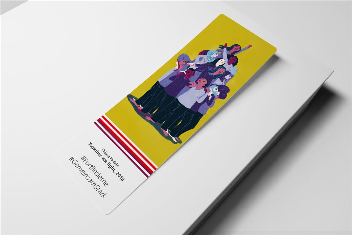 Das Lesezeichen will eine Botschaft der Stärke vermitteln: Auf einer Seite findet sich die Aussage der pakistanischen Aktivistin und Friedensnobelpreisträgerin von 2014, Malala Yousafzai, die sich besonders für die Rechte der Kinder und das Recht auf Bildung einsetzt. Auf der anderen Seite des Lesezeichens sieht ist ein Werk der Künstlerin Chiara Fedele aus dem Jahr 2018 abgebildet, das starke und glückliche Frauen zeigt, die in wertschätzender und gleichberechtigter Weise von Männern getragen und gestützt werden. Das Werk trägt den Titel "Together we fight" (Wir kämpfen gemeinsam) und passt somit gut zum Euregio-Motto "#GemeinsamStark".