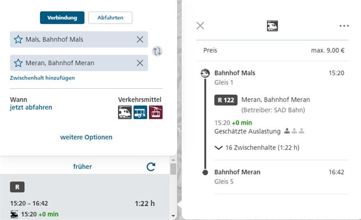 In der südtirolmobil-Fahrplansuche werden die Fahrgäste nun auch über den jeweiligen Auslastungsgrad informiert. Aktuell wird der geschätzte Auslastungsgrad in einem ersten Schritt für die Regionalzüge angezeigt. Künftig soll es die Funktion auch für die Busverbindungen geben.