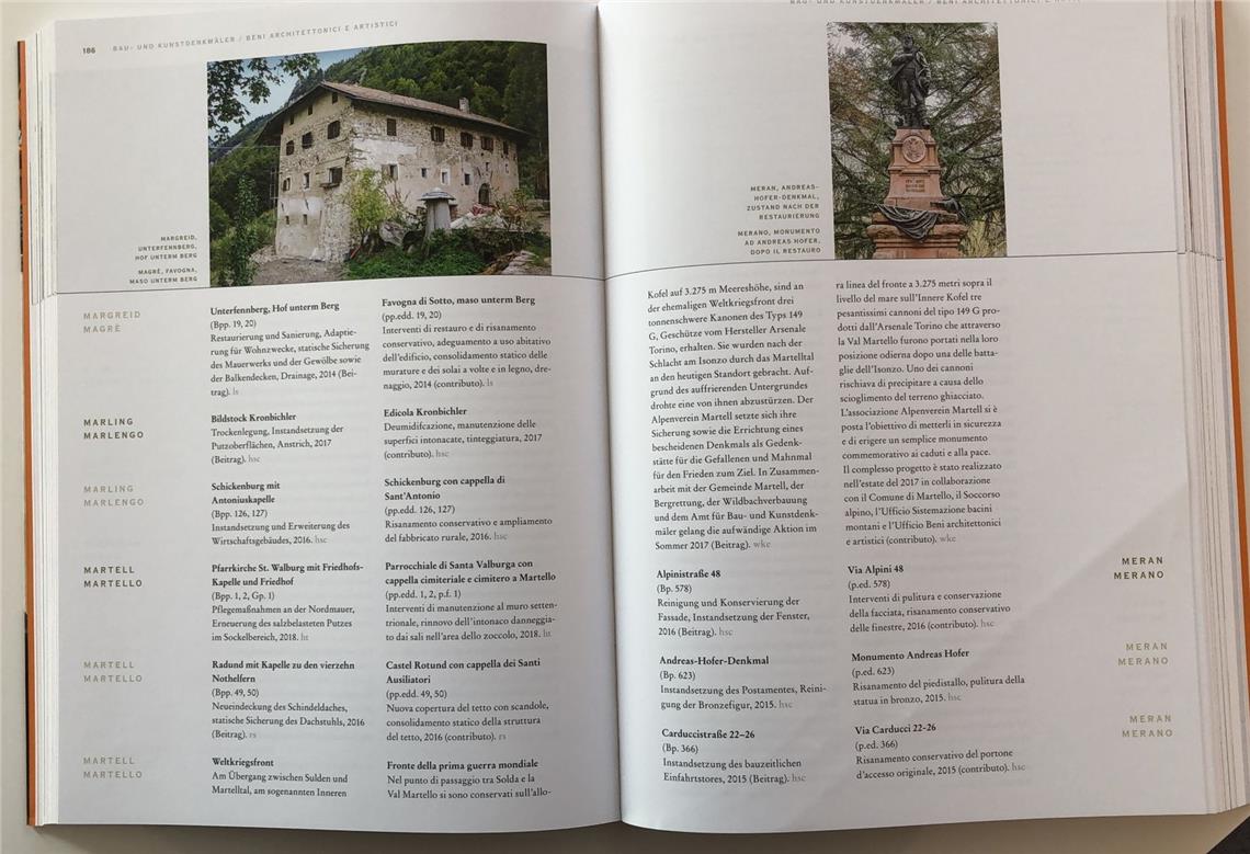 Die Tätigkeit des Landesdenkmalamtes mit seinen drei Ämtern, jenem für Bau- und Kunstdenkmäler, jenem für Archäologie und dem Südtiroler Landesarchiv, dokumentiert der neu erschienene Band Denkmalpflege 2014-2018, den das Landesdenkmalamt herausgebracht hat und der im Buchhandel erhältlich ist. Die neue Publikation wird in Kürze auch ich digitaler Form auf den Landeswebseiten zu Kunst und Kultur unter Denkmalpflege zur Verfügung stehen.