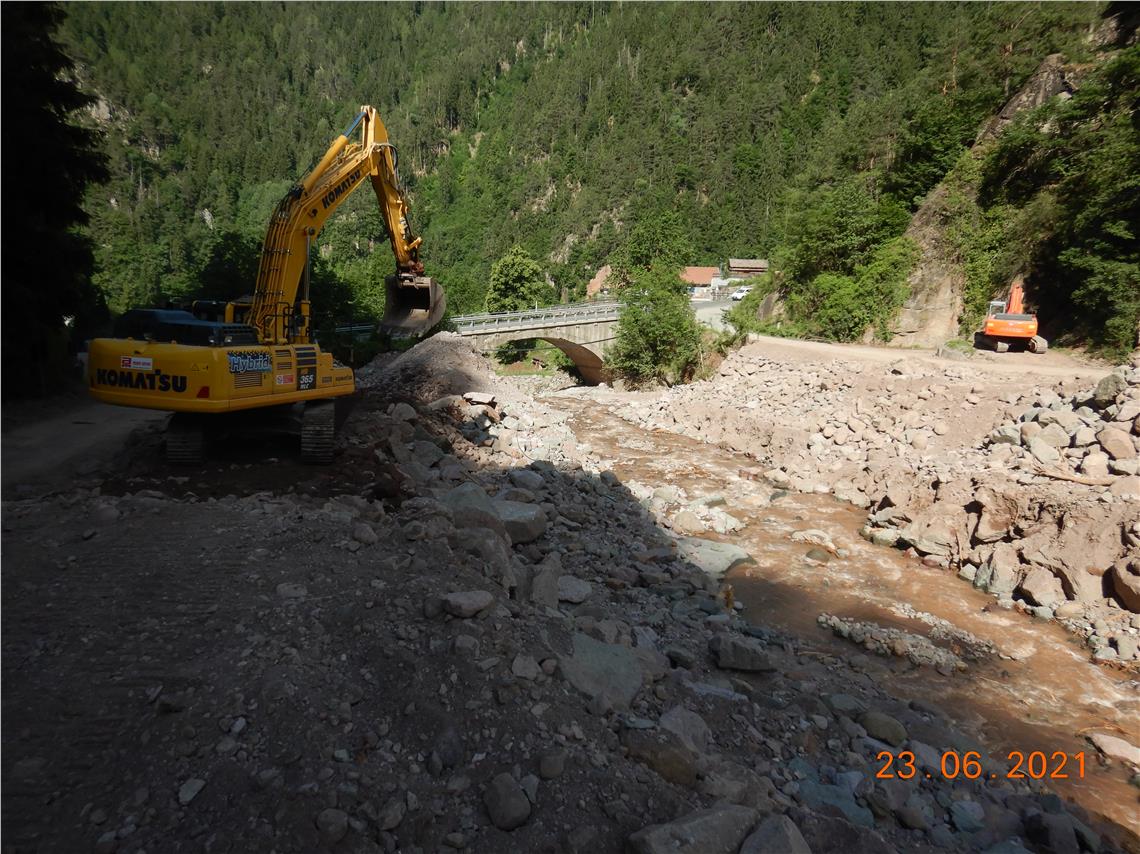 Die Mitarbeiter der Wildbachverbauung haben unverzüglich die Arbeiten aufgenommen und sind derzeit bei den beiden Schwerpunkten Tanzbach im Sarntal und Wangenerbach in Wangen am Ritten aktiv: Bei der Mündung Tanzbach-Osterbach räumen sie massive Geschiebeanlandungen weg und stellen auch die Befahrbarkeit der Zufahrten zu drei Höfen wieder her, die abgeschnitten waren; der letzte bisher abgeschnittene Engelbert-Hof ist seit gestern wieder über eine neue geschotterte Straße erreichbar. Vorarbeiter Albert Premstaller ist zudem dabei, die weggerissenen Ufermauern am Tanzbach und Osterbach wieder zu errichten und einen Unterbau zu schaffen, auf dem die Gemeinde Sarntal weiterbauen kann. Im Einsatz sind fünf Bagger und drei Lastkraftwagen mit acht Männern. Derzeit ist eine provisorische Überfahrt über einen Schotterkegel möglich, die beiden Brücken müssen erst wiedererrichtet werden. Auch in Unterwangen konnte eine zerstörte Ufermauer samt Zufahrt wiedererrichtet und die Erreichbarkeit der Gebäude gewährleistet werden. Die Arbeiten zur Wiedererrichtung der Uferschutzmauern werden anschließend im Dorf Wangen direkt fortgesetzt.