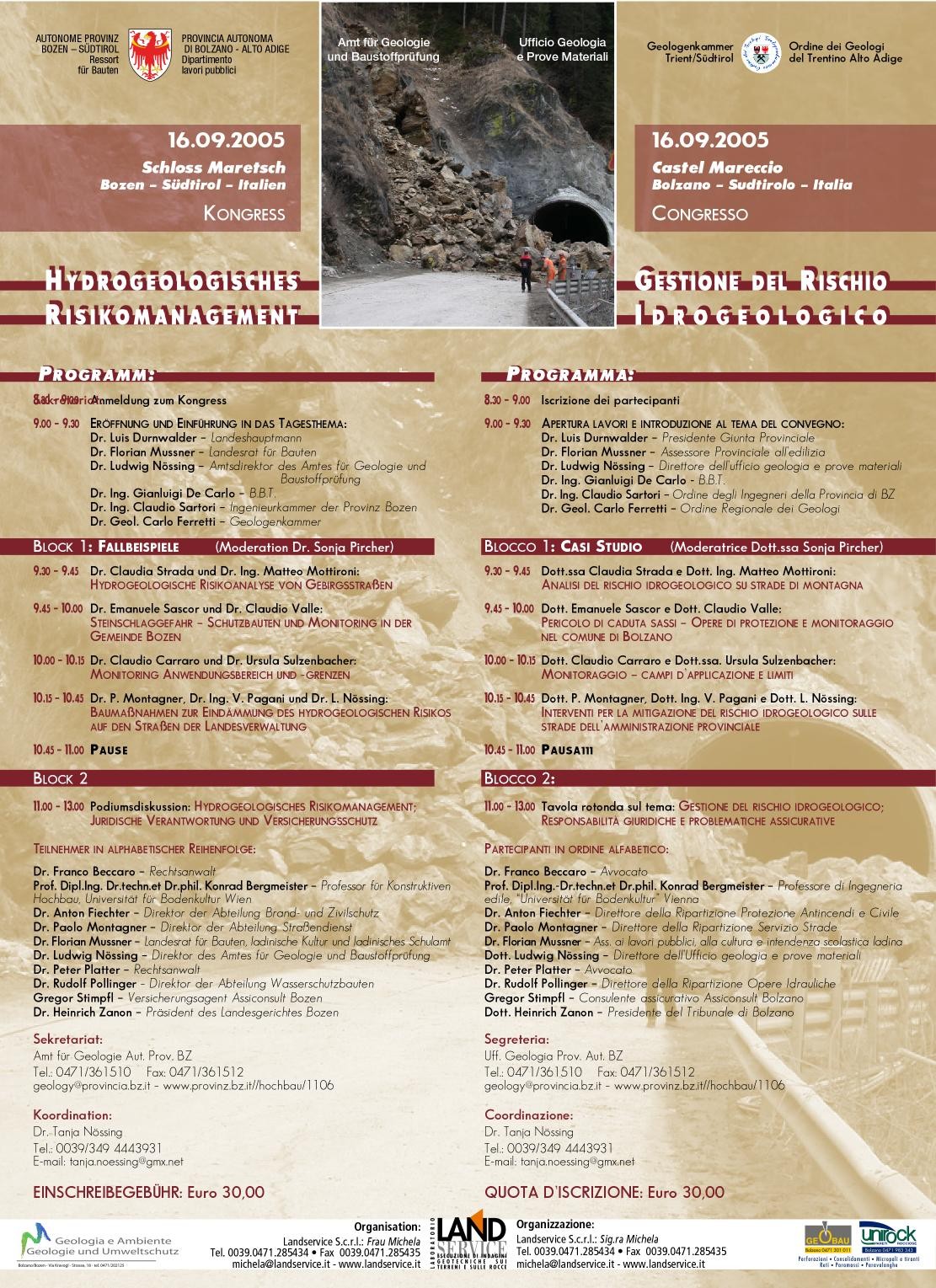 La manifestazione, che vedrà la presenza, oltre al presidente della Provincia, Luis Durnwalder, e dell’assessore provinciale ai lavori pubblici, Florian Mussner, di una serie di esperti del settore, è rivolto in primo luogo ai geologi ed agli ingegneri, nonché a tutti coloro che sono interessati a questa specifica tematica, dai liberi professionisti agli amministratori.Il convegno sarà moderato dal Dr. Ludwig Nössing, direttore dell’Ufficio geologia e prove materiali della Provincia Autonoma.