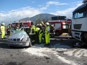 Una vettura, BMW Serie 3, è stata centrata sul lato guida da un camion. Il conducente della macchina è rimasto incastrato nell'abitacolo. Il medico d'urgenza della croce bianca ha provveduto al soccorso primario ed alla stabilizzazione del paziente, che è stato liberato dai vigili del fuoco dopo circa un'ora di lavoro.