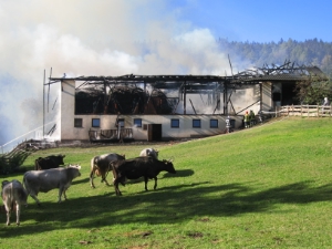 All’arrivo sul posto il fienile era in fiamme, l’incendio minacciava una casa accanto e il bosco. Nella stalla erano presenti ancora degli animali. |