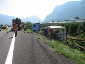 Sulla corsia sud dell´autobrennero oggi pomeriggio verso le ore 15 all´altezza di egna si é verificato un'incidente tra un autotreno ed un'autovettura. Nell´incidente non vi sono stati feriti. Sia la vettura che il camion, che si é rebaltato fuori strada nei campi sottostanti, hanno subito parecchi danni. A causa del ribaltamento il camion ha perso gasolio ed i pompieri hanno lavorato ca un ora per aspirare tutta la nafta dal serbatoio che perdeva.