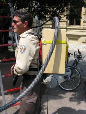 In collaborazione con l'associazione degli apicoltori, e del servizio veterinario provinciale ha potuto ottenere un risultato ottimale modificando un normale aspirapolvere per "aspirare" le api.