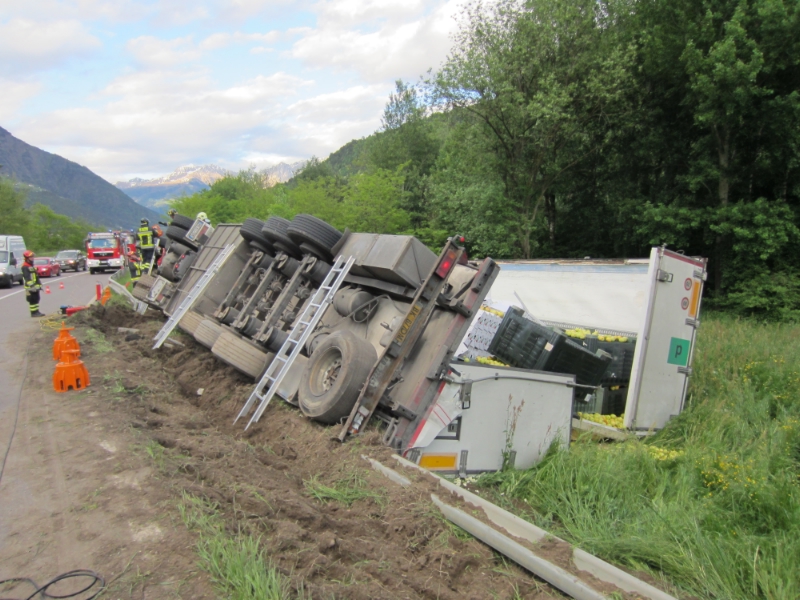 FOTO BFBZ VVFBZVerso le ore 18:30 questo corpo permanente e´stato allertato per un intervento di gru a Rablà. Qui, un semirimorchio frigo trasportante un carico di mele all´altezza di una doppia curva é uscito di strada adagiandosi sul suo lato destro. L´autista del mezzo é stato soccorso dal servizio sanitario provinciale giunto sul posto ed é stato trasportato all´ospedale. Per il recupero del mezzo e´stato necessario innanzitutto metterlo in sicurezza avendo lo stesso avuto una perdita di gasolio dal serbatoio. Con l'ausilio di due autogru si procedeva poi al recupero in contemporanea della motrice e del rimorchio che venivano adagiati sulla carreggiata stradale. I lavori di recupero sono durati fino alle ore 22.00 ca.. A supporto erano presenti sul luogo dell'intervento anche i vigili del fuoco volontari di Rablá,Tel e i carabinieri.